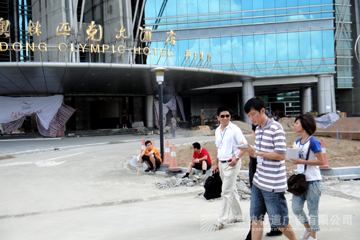 我公司总负责实施的广东奥体中心游泳跳水馆是本届亚运会形象景观样板工程。 图为2010年9月30日亚组委领导等与我公司人员合影